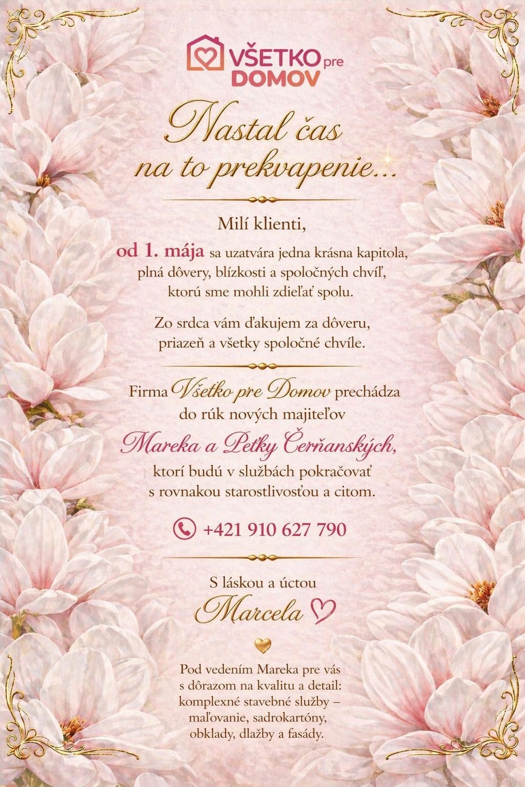 Budem rada, keď sa rozhodnete práve pre našu firmu a verím, že profesionálny prístup a kvalitné služby, ktoré Vám garantujeme neoľutujete.
